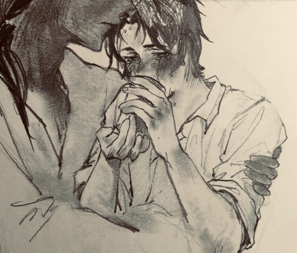 你将板子拿了起来,给了他时间缓了缓。等到他自己意识到自己做了什么,通红着脸低低抽泣了几声,要将手默默的收回去的时候,你将自己的手覆盖上了他的手。